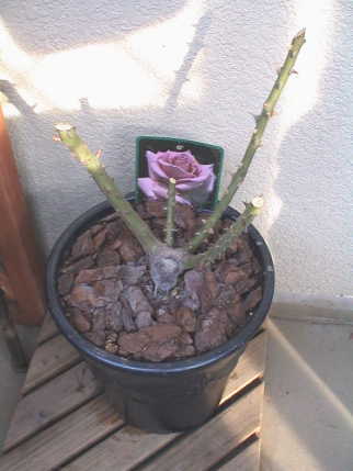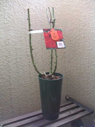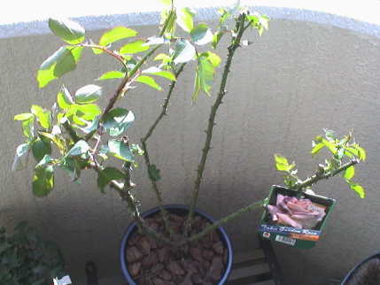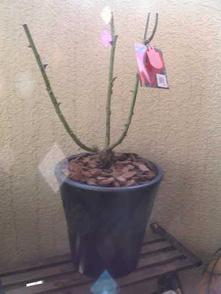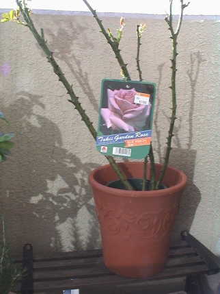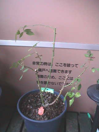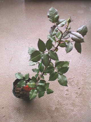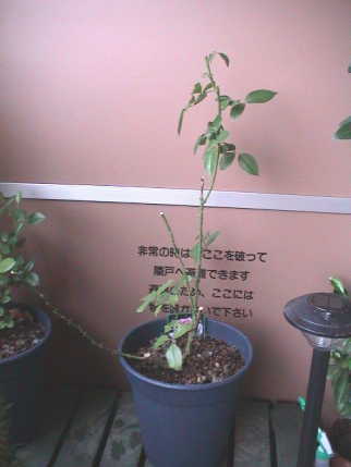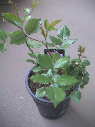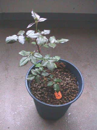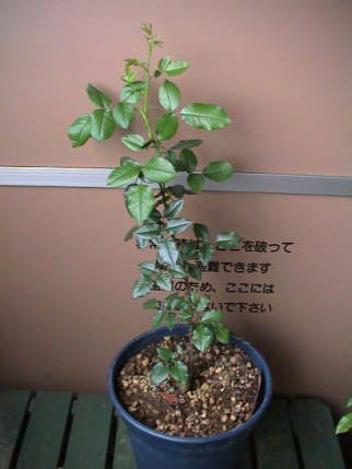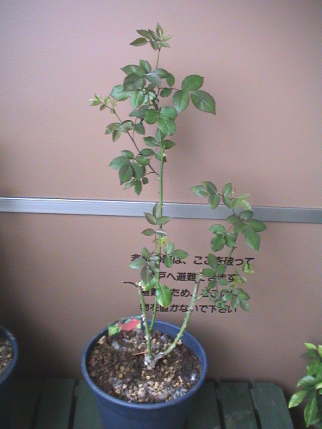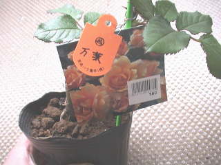 何気なくバラのコーナーを見ると新苗が並んでいる。秋の大苗まで待とうと思っていた万葉が目に止まり思わず買ってしまった。¥980。