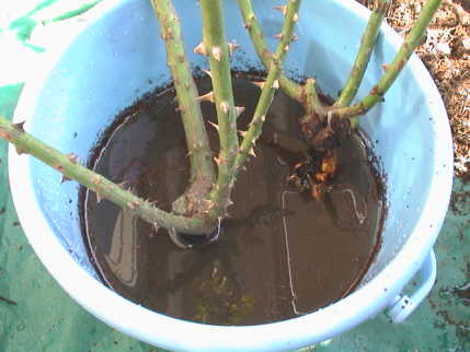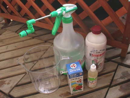 説明書通りに,1000cc の水にサプロール乳剤を付属のスポイトで1cc入れ,展着剤を4滴ほど入れて棒でかき混ぜる。かき混ぜないと乳剤が白く固まり拡散しない。これを噴霧器に入れる。ビニール袋の一辺を切ってバラを覆い,その中で葉表,葉裏に満遍なく散布する。まだまだ葉も少ないので2つで 500cc 程度しか使わなかった。