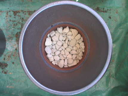 ・ 赤玉土(小粒) : 6土を入れて,その上に大苗の根を広げるようにのせて土をかぶせる。割り箸でザクザク苗の周りを刺して土が根の間に隙間なく入りこむようにする。最後に鉢を軽くトントンと床に打ちつけて表面をならす。これが以外に目減りするもので土を補充する。