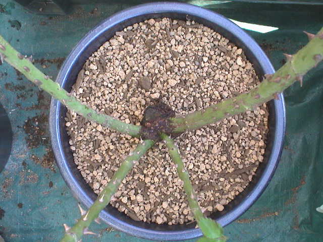 中央奥の背の低い枝と右奥の枝の先が枯れてきている。どちらも良い芽が出ていない。とりあえず枯れて茶色になっている枝を剪定する。もし,良い芽が出てこなかったらその時は根元から剪定するつもり。