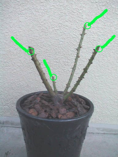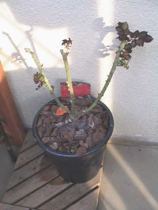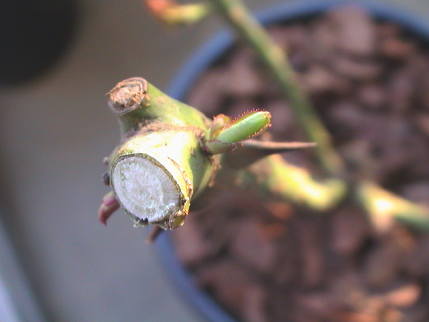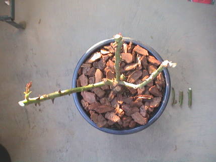 ブルーリボンは右の芽を折ってしまったが,その枝にはなかなか他の芽が出ない。唯一出た芽の所で剪定をする。大分下だった。奥の細い枝からは全く芽が出なかったので思いきって根元から切った。