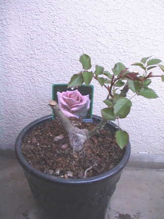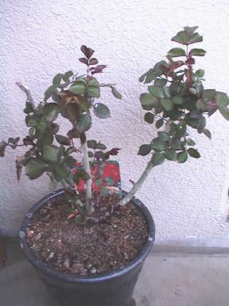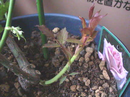 レッドシンプリシティーの方が葉の色が濃く,生育が非常に旺盛だ。根元から芽が出て伸びてきた。葉の数が5枚でノイバラの7枚とは違うため台芽ではなさそう。様子を見る。