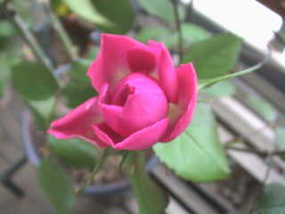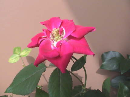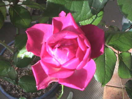待ちに待った開花。花径 7cm。色は赤というよりピンクに近い。香りも良い。