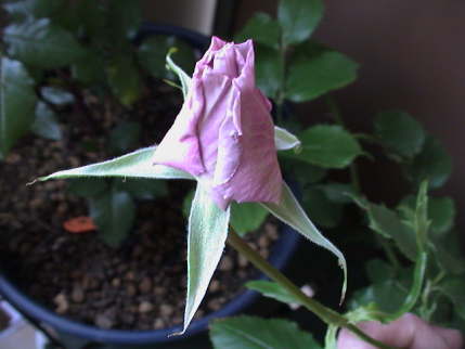 ひろこに,「一つだけならどれがいい?」と持ちかけたところ,やはりバラの象徴である剣弁高芯咲き(けんべんこうしんさき と読むのか?) のハイブリッド・ティー種のブルー(藤色)系マダム・ヴィオレか,真紅のイングリッド・バーグマンかということになった。