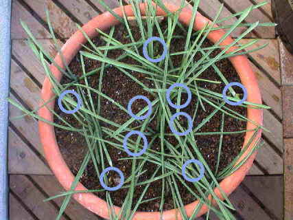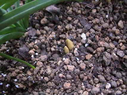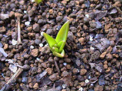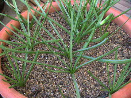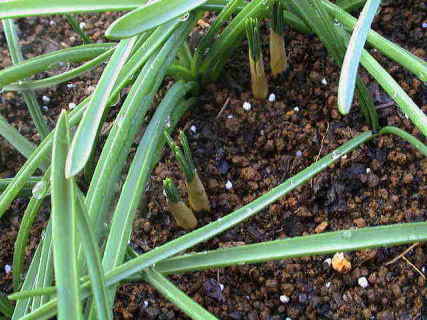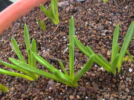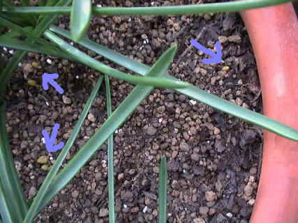 発芽から約2週間。すべてのムスカリが芽を出した。球根の脇の小さい球根(子球)からも芽が出ているようだ。