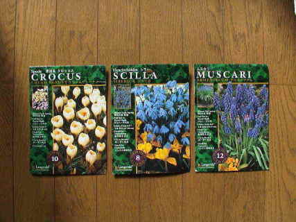 左からクリーム色のクロッカス,青のシラー,濃青のムスカリ。