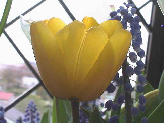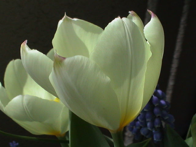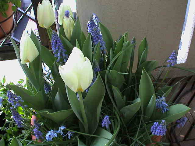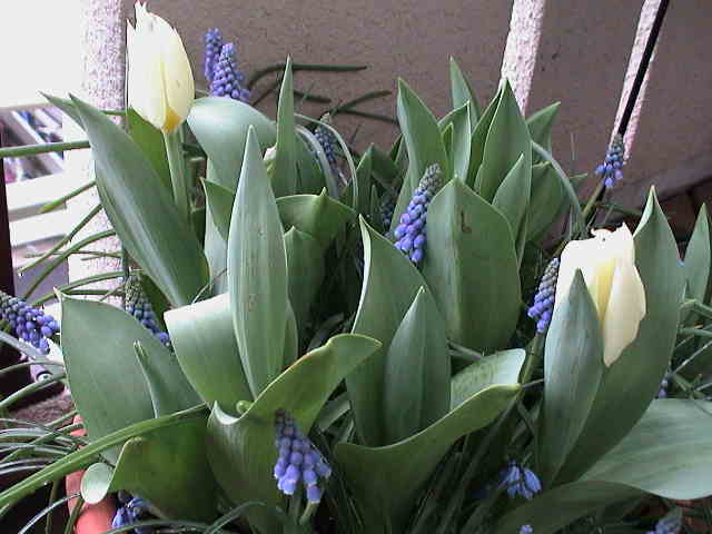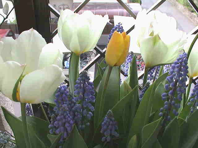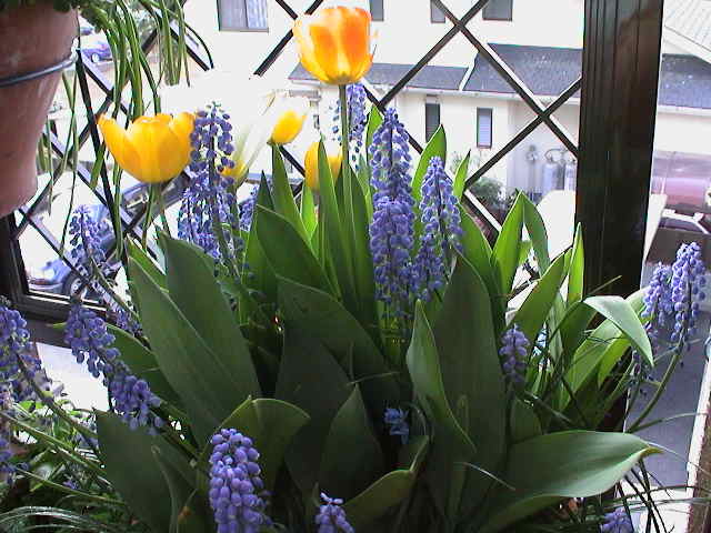 チューリップの丈は低いけど,ムスカリは異様に背が高い。白に黄色(オレンジ)に青の取り合せは,葉の鮮やかな緑色とあいまって綺麗だねえ。安心できる彩り。